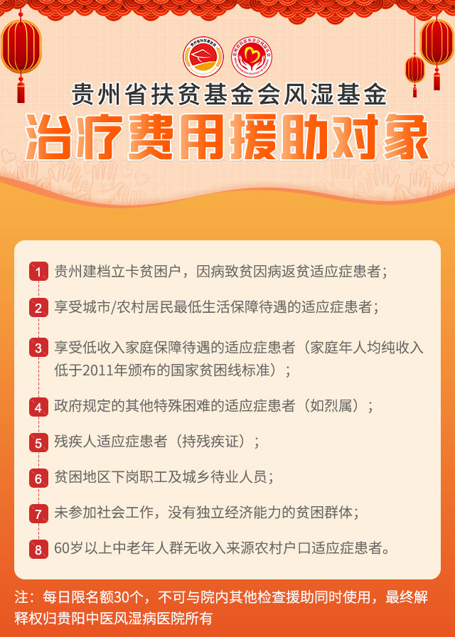“贵州省扶贫基金会风湿基金”治疗费用援助帮扶10%-30%(经审核,符合条件的适应症患者;门诊、住院治疗费用,不含药品费用)。
